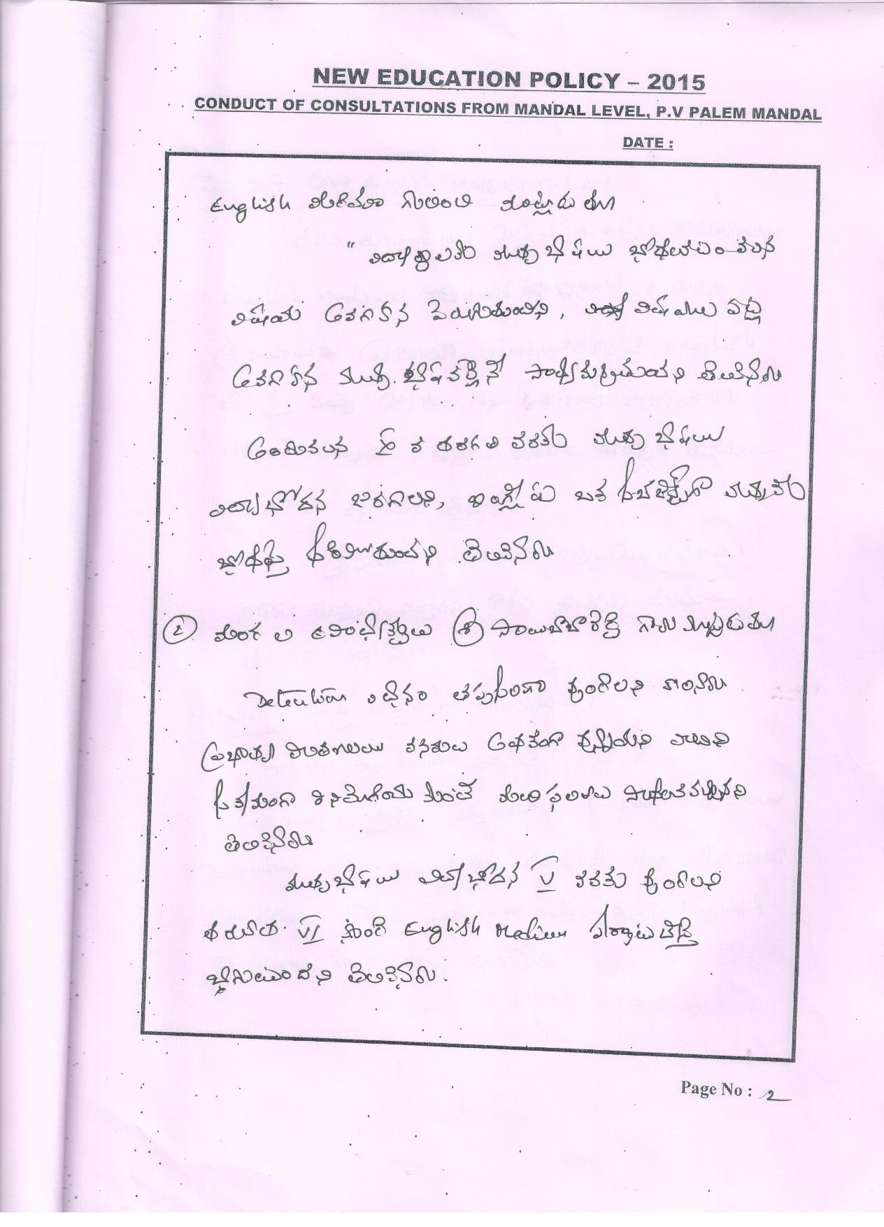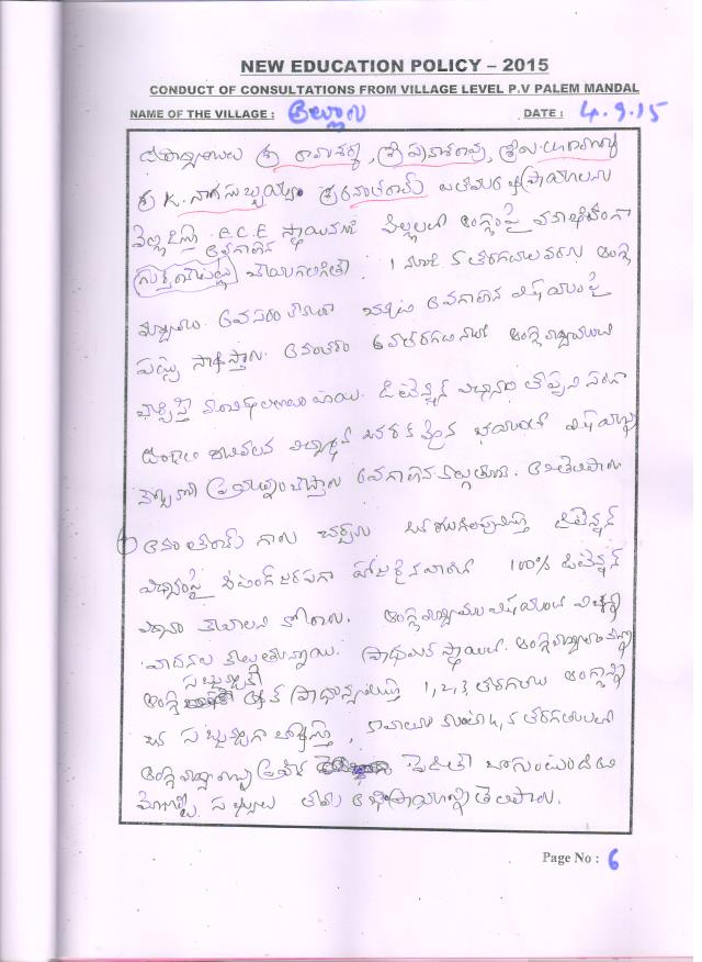 I am M.Venkateswara Rao, Mandal Educational Officer, PEDAKURAPADU.We conducted work shop on New Education Policy - 2015 at Village Level and mandal level. We are submitting our discussions and some of the images.pls find the below attachments.