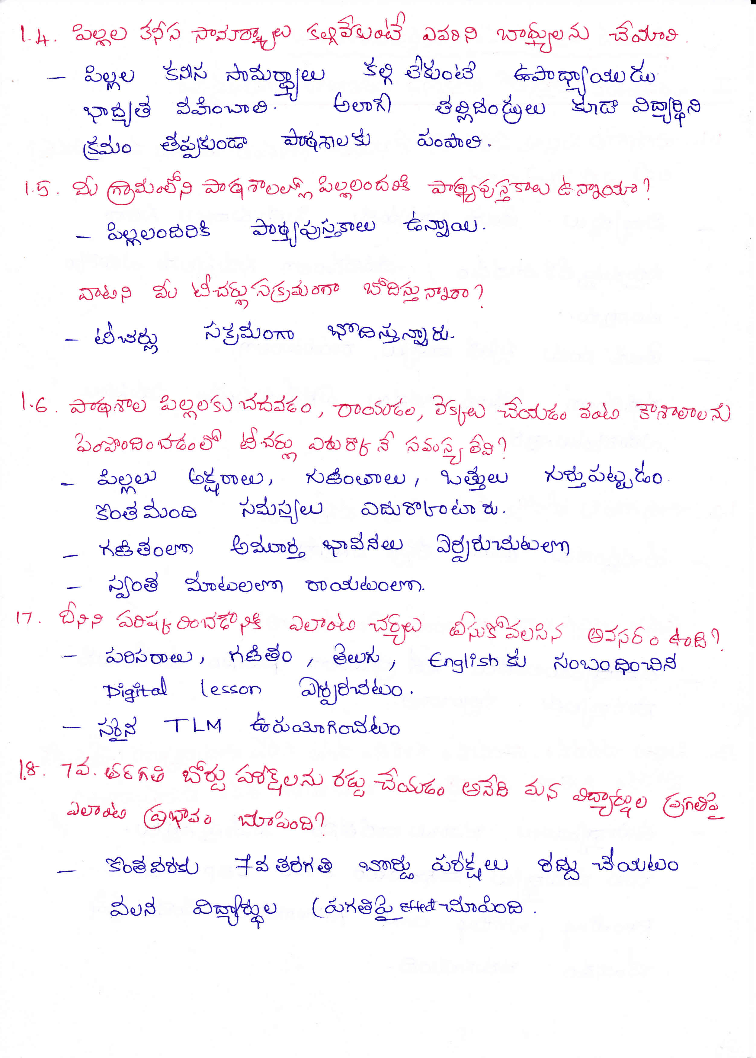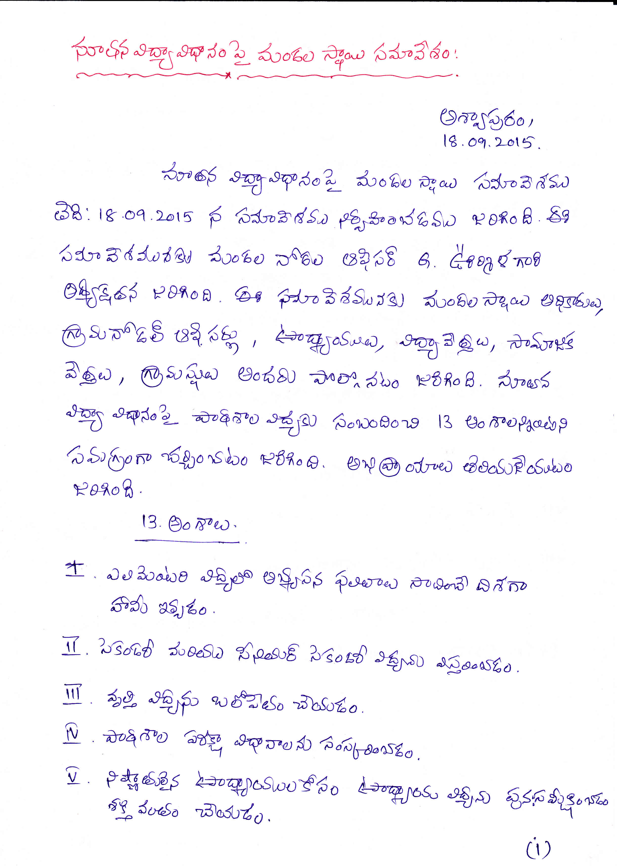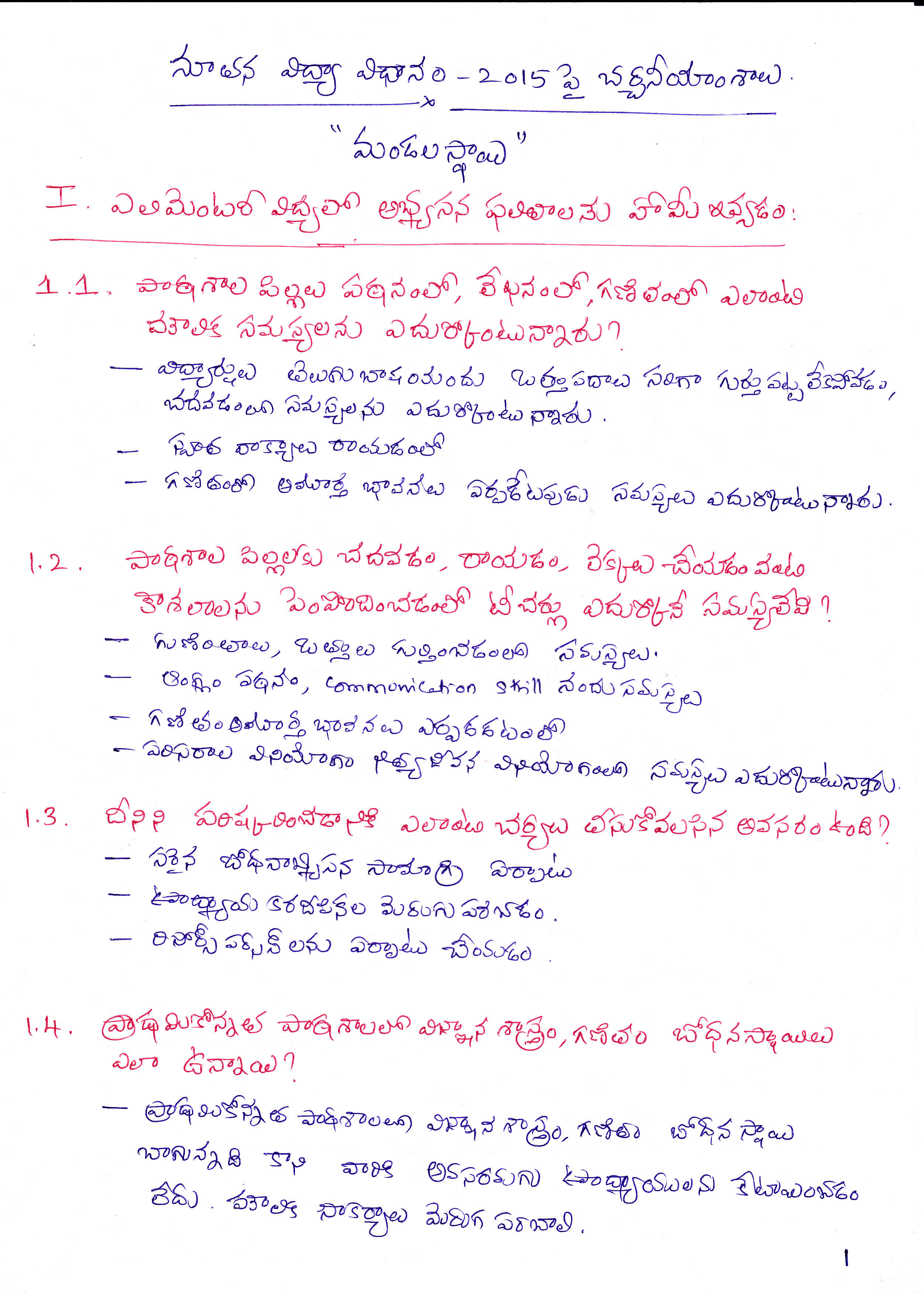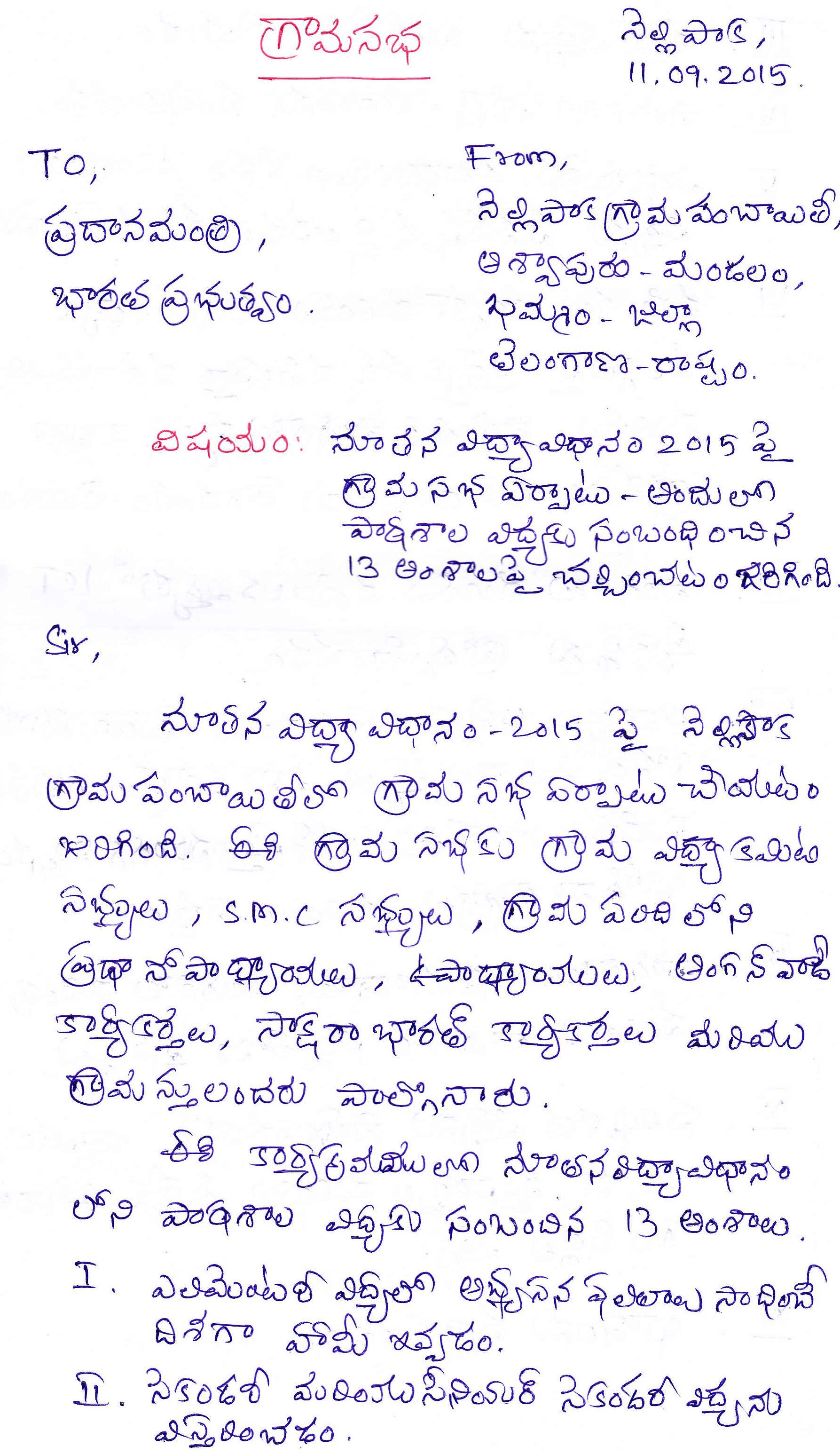 Sir,I am S.Niranjan,Mandal Educational Officer,Bapatla Mandal,Guntur District,Andhra pradesh,we conducted workshop on New Education Policy 2015 at Village Level,Mandal Leve and Urban Level.We are submitting our discussions and some of the images.pls find the above attachments.