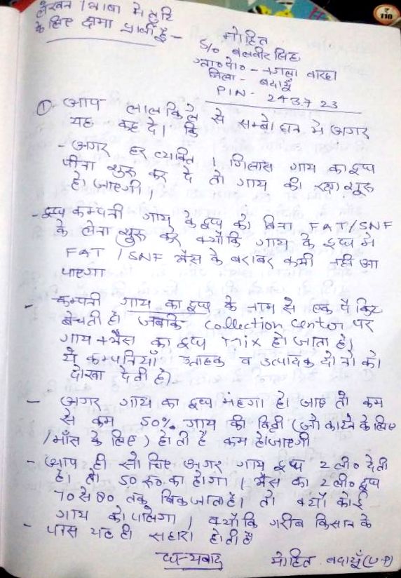 सर अब वक्त आ गया है जब हमें फिर से आजादी की लौ देशवासियों के दिलों में जगानी होगी। हर हिन्दुस्तानी एक देशभक्त है सिर्फ जरूरत है उनमें सोई हुई देशभक्ति को जगाने की और मुझे पूर्ण विश्वास है कि यह काम आप बखूबी कर सकते है और सिर्फ आप ही कर सकते हैं क्योंकि न जाने देश को फिर ऐसा कोई बेटा मिलेगा या नहीं जो सिर्फ अपने देश के लिये अपना पूर्ण जीवन समर्पित कर देगा। लालकिले की प्राचीर से एक बार फिर आजादी का बिगुल बजाकर सवा सौ करोड़ देशवासियों को अपनी देशभक्ति की ताकत पर भरोसा करना सिखा दीजिये।