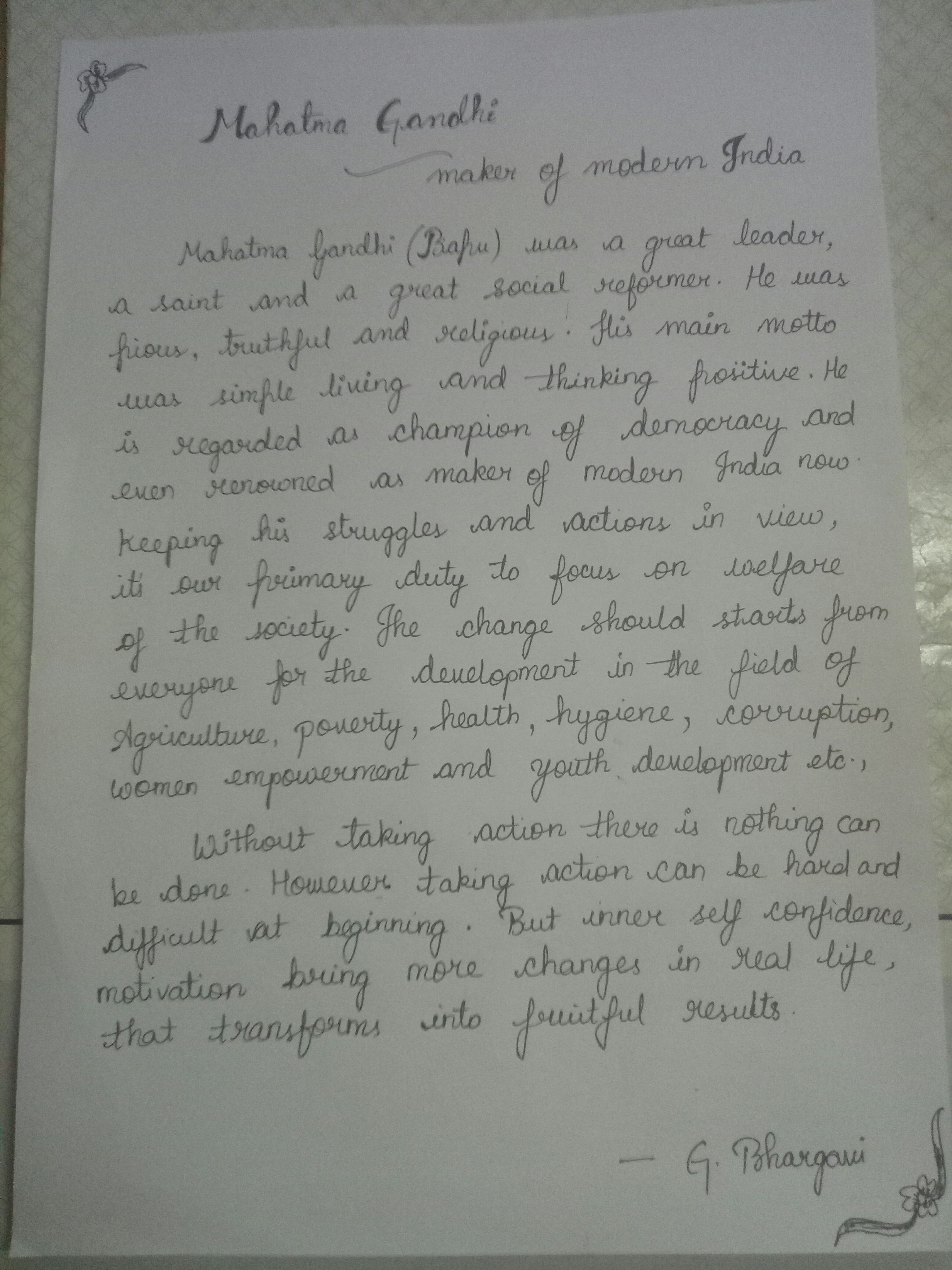 Mahatma Gandhi(Bapu) was a great leader, a saint and a great social reformer. He was pious, truthful and religious. Main motto of Bapu is simple living and high thinking. He was always a champion of democracy, renowned as maker of modern India now. Keeping his struggles and actions in view, it's our primary duty to focus on welfare of the society. The change or transformation should starts from agriculture, poverty, health hygienic, women empowerment and youth development.