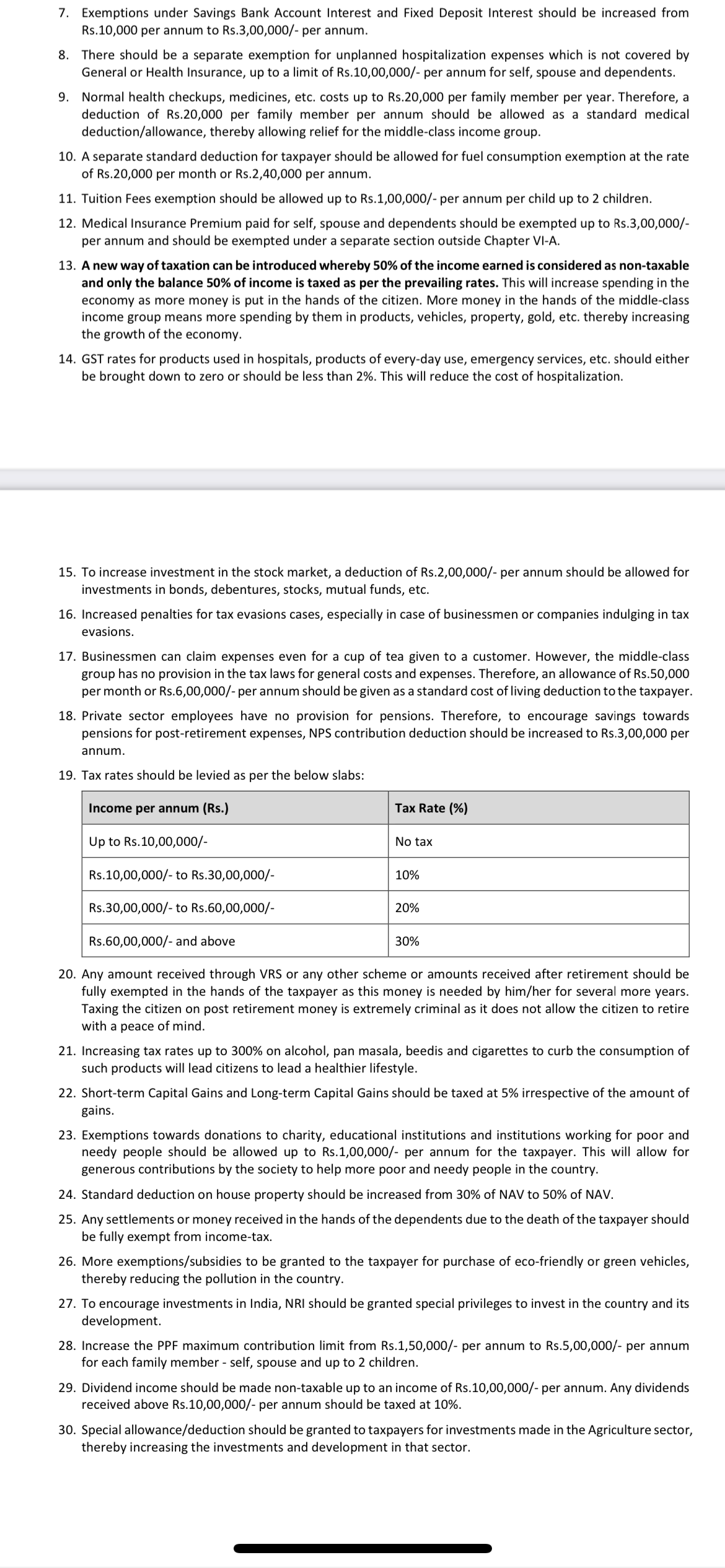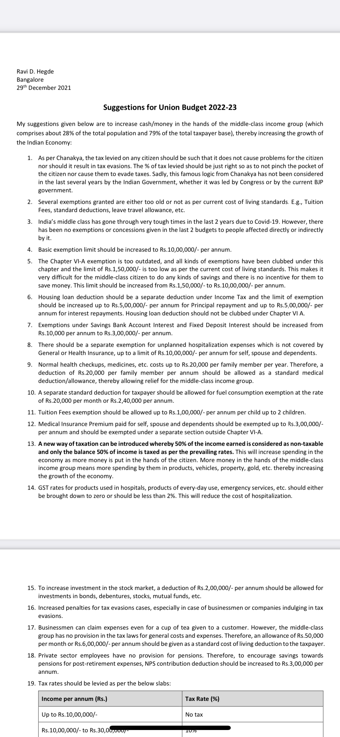 Please go through the 30 suggestions attached in the 2 screenshots for the Union Budget 2022-23 which will help in improving the Indian Economy.