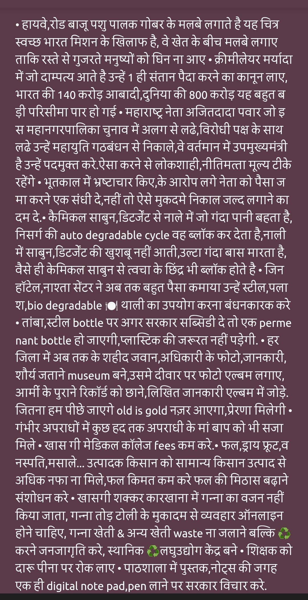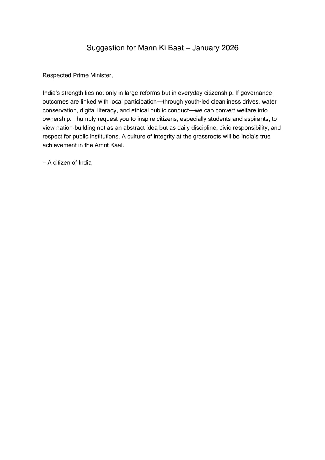 I wish to highlight some serious issues faced by our country today, such as the growing gap between rich and poor, corruption, unemployment, and the need for stronger improvement in the health and education sectors. Many citizens still struggle with access to quality healthcare, affordable education, and equal opportunities. Through awareness, transparent systems, better implementation at the grassroots level, and public participation, these problems can be addressed step by step. Sharing these concerns through Mann Ki Baat can inspire collective responsibility and positive action for a stronger and more inclusive India.India’s strength lies not only in policies, but in the participation of its people. If citizens, government, and institutions work together with honesty and compassion, a stronger and more just India by 2030 is truly possible.