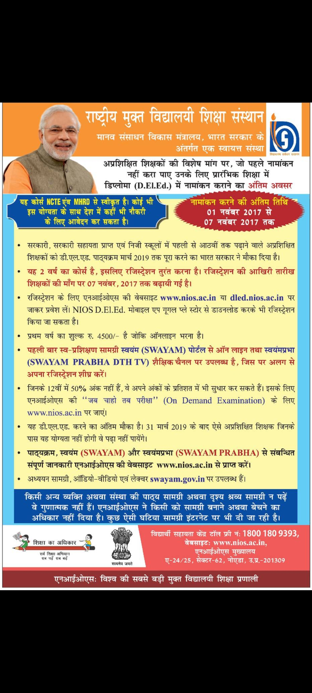 Respectable Prime Minister of India Sir we are NIOS DELED candidate of your country are pray to you. that your dreem project was NIOS DELED has invalid by suprime courte. we are 14 lakh student of this project.