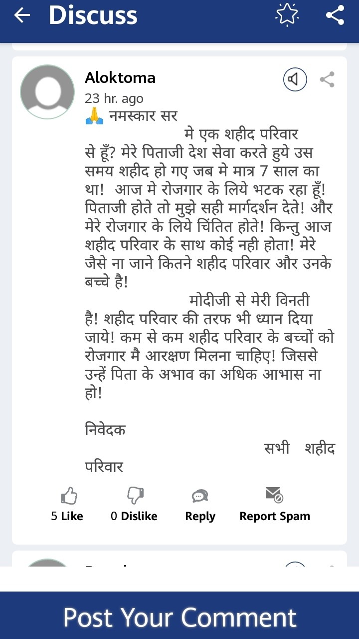 Respected Sir, mann hai aapka sujhaav aap sabse le rahe hain achchi baat hai. On this platform I read a post of a Young unemployed son of a "Shaheed" person, attaching the screenshot of that..
