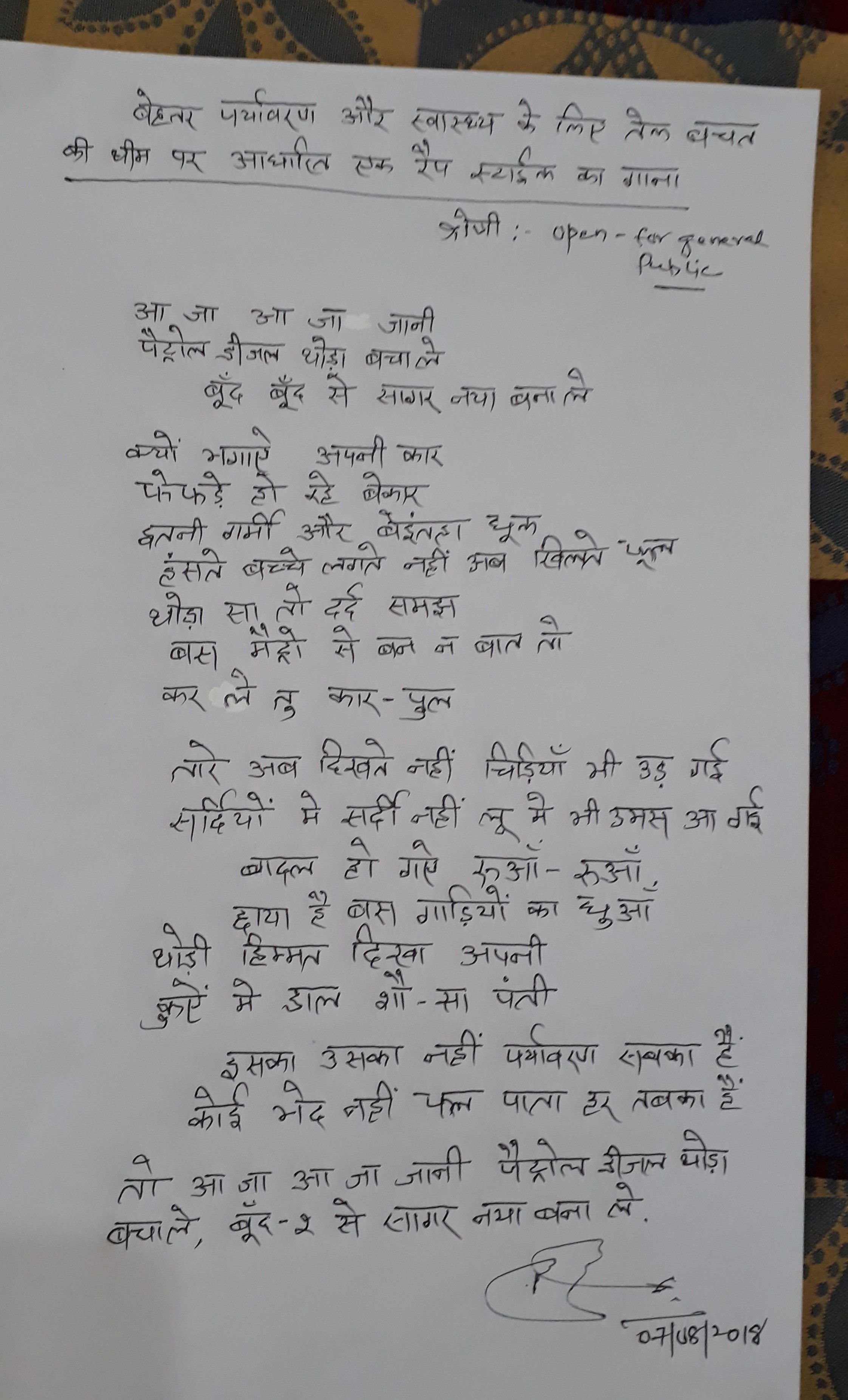 पेट्रोलियम संरक्षण अनुसंधान संघ (पीसीआरए) देश में तेल संरक्षण को राष्ट्रीय आंदोलन बनाने के लिए प्रतिबद्ध संस्था है, जो पेट्रोलियम और प्राकृतिक गैस मंत्रालय के तहत कार्यरत है। तेल संरक्षण की मुहिम के तहत कविता / गीत प्रतियोगिता आयोजित की जा रही है।