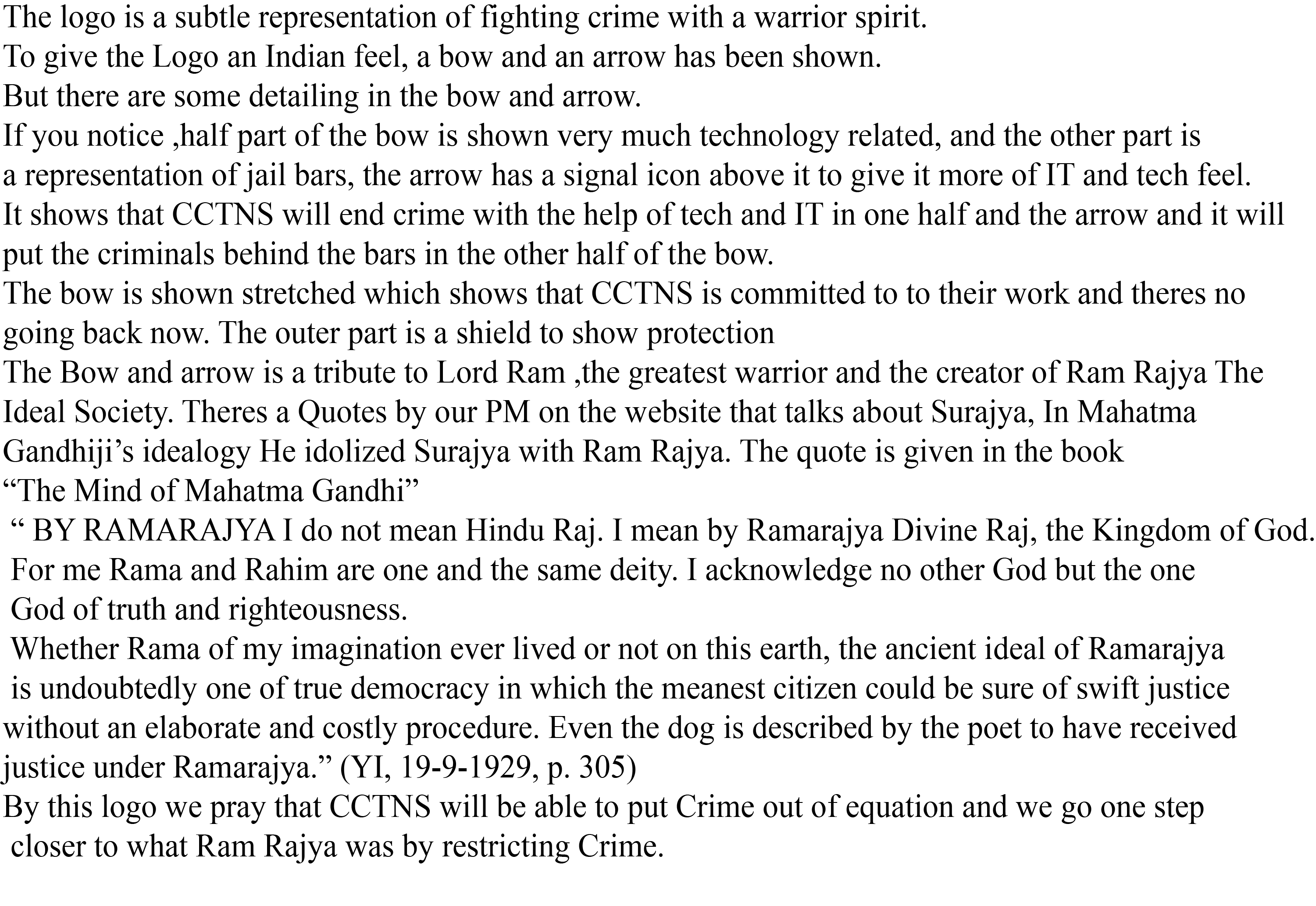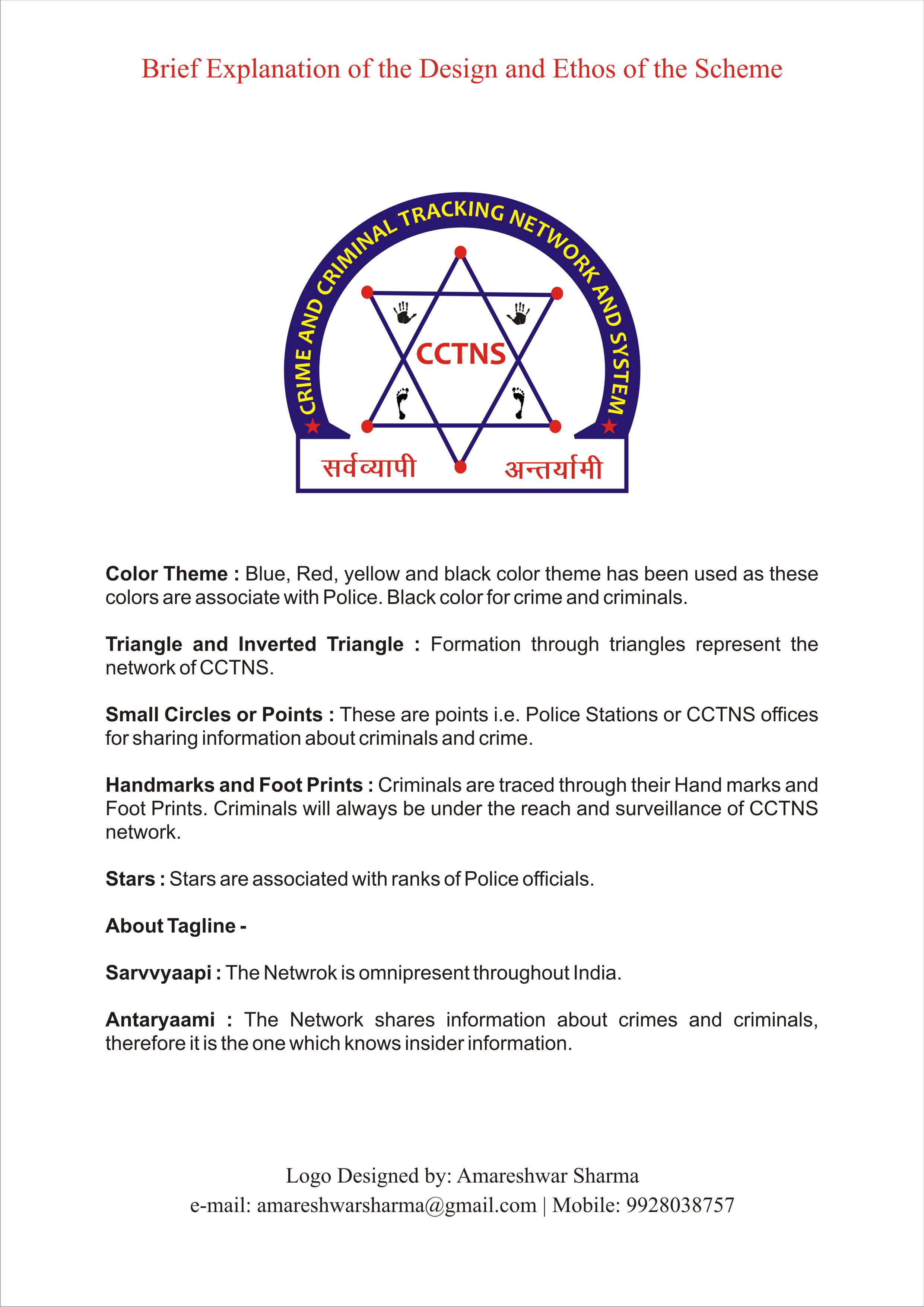 In the logo, handcuff closed by chain at one end and connected by wireless network (indicated with WIFI and tower) represents that the criminals are with the range of police through the internet technology. The stars at the middle highlights the Indian Police. #MinistryofHomeAffairs, #CrimeandCriminalTrackingNetworkandSystems, #CCTNS, #MyGov Sunil D. Potekar, Sci-D, NIC, Nanded (MS) – Mob. 9422874288