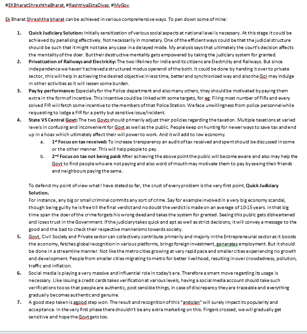 With this view, MyGov introduces the ‘EK Bharat Shreshtha Bharat’ contest. Citizens are invited to submit their ideas and suggestions on how the programme should be structured so as to encapsulate its true spirit in all its various dimensions and capture the diversity that characterises India.